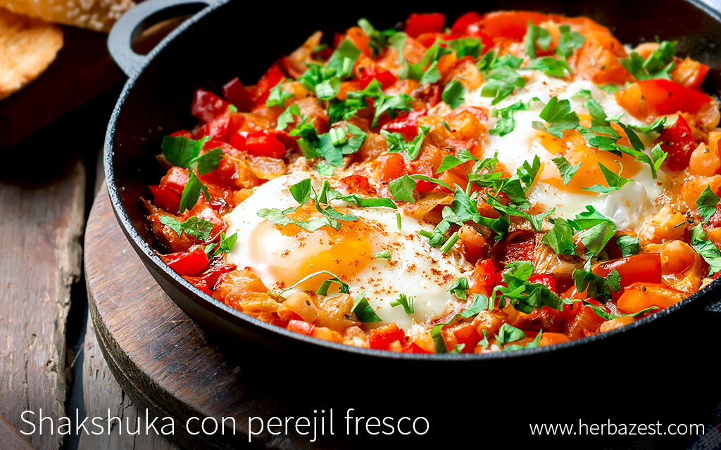 Este plato típico del Medio Oriente no solo sorprende con una deliciosa combinación de sabores y una bella presentación, sino que también está elaborado con ingredientes saludables, con importantes propiedades medicinales. Los tomates, debido a su riqueza nutricional, tienen un fuerte valor preventivo, particularmente para reducir el riesgo de enfermedades cardíacas, osteoporosis y otras enfermedades inflamatorias. Los pimientos rojos son excelentes para reducir la inflamación y promover la salud visual, mientras que los fenoles, flavonoides y aceites esenciales del perejil proporcionan no solo beneficios antiinflamatorios, sino también antivirales y antioxidantes. Los huevos, escalfados en una salsa de tomate espesa, son una excelente fuente de proteína y otros nutrientes, como selenio y vitaminas A, B, y D.