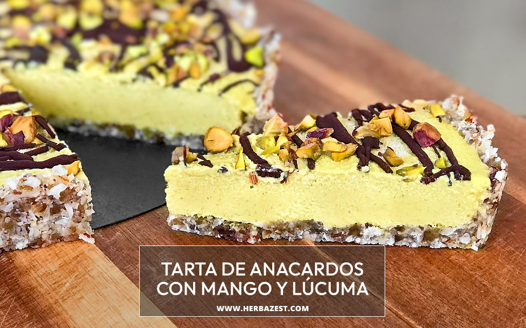 Esta tarta vegana sin horno, de sabor exótico, está elaborada íntegramente con ingredientes saludables, como una suave crema de anacardos combinada con pulpa de mango y lúcuma en polvo, cuyos sabores le dan a esta receta crudivegana un toque especial. Servida sobre una base rica en fibra, esta tarta de anacardos con mango y lúcuma es un postre tan saludable como delicioso.
