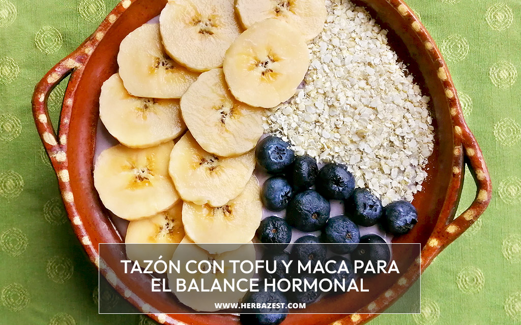 Este batido en tazón proporciona una potente combinación del tofu (con las propiedades estrogénicas de la soja, o soya), la maca, que estimula la producción natural de hormonas reproductivas, y la quinua, una completa fuente de aminoácidos esenciales que el organismo transforma en proteína para el desarrollo muscular. La adición de frutas antioxidantes y ricas en fibra, como los arándanos y el plátano, hacen de este tazón con tofu y maca para el balance hormonal una opción ideal para un desayuno saludable.