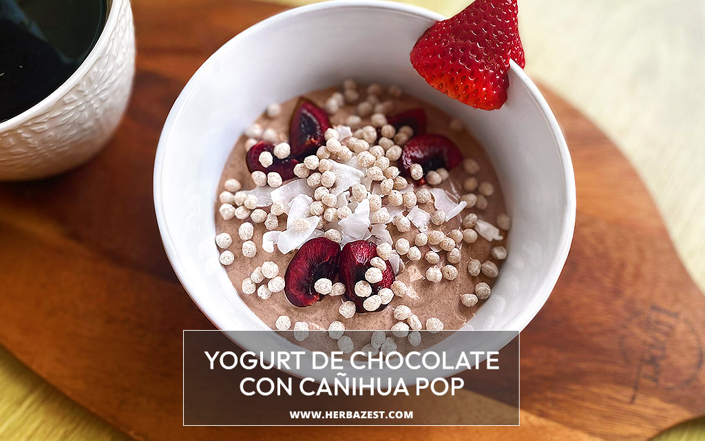 Este sencillo y delicioso yogurt de chocolate con cañihua pop es ideal para quienes gustan del yogurt saborizado pero quieren evitar las opciones comerciales, llenas de azúcar y conservantes. Está elaborado con solo cuatro ingredientes, cargados de proteínas, probióticos y antioxidantes, entre ellos cacao en polvo. Puede endulzarse de forma natural con stevia, miel o jarabe de arce. Cubierto con cañihua pop, coco en hojuelas y cerezas, es un desayuno ligero pero sumamente nutritivo.