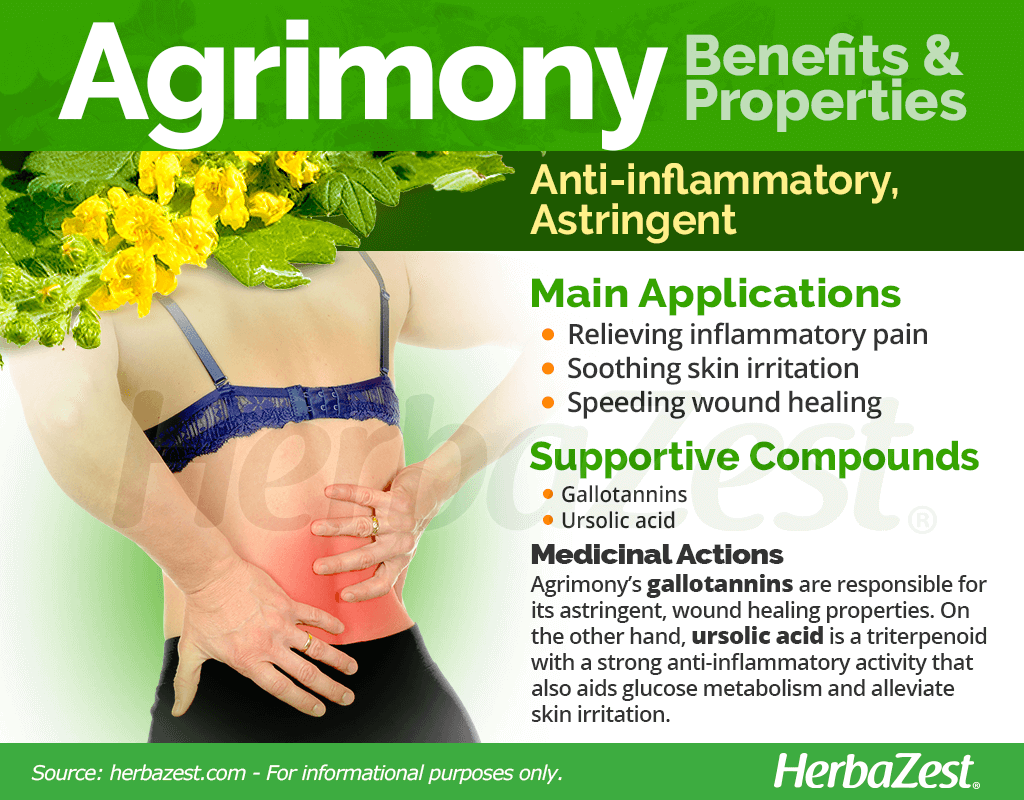 Relieving inflammatory pain. Agrimony encourages blood flood, which reduces swelling and pain.