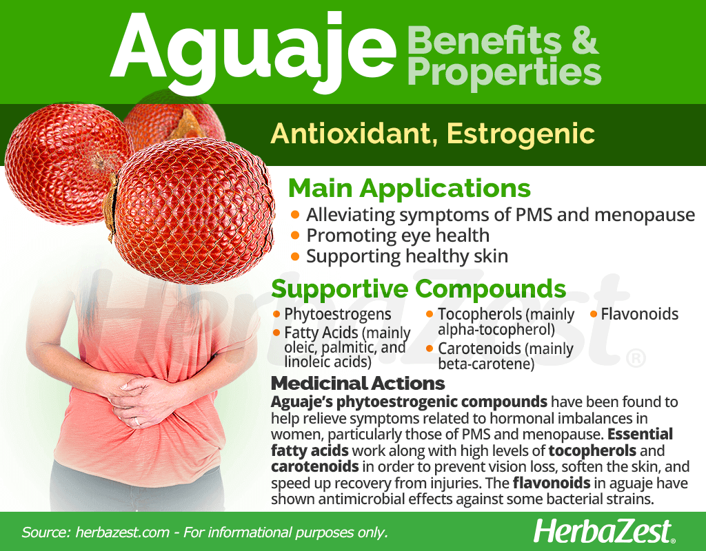 Alleviating symptoms of PMS and menopause. Rich in phytoestrogens, aguaje can relieve menstrual discomforts as well as symptoms of estrogen deficiency during menopause.1