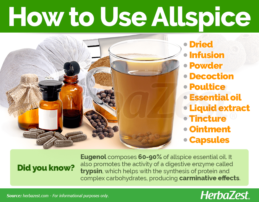 Infusion. The leaves and berries of allspice can be steeped in hot water and are traditionally taken to relieve colic, colds, dysmenorrhea, dyspepsia, and flatulence. Allspice is also known to be used as a stimulant and overall depurative.