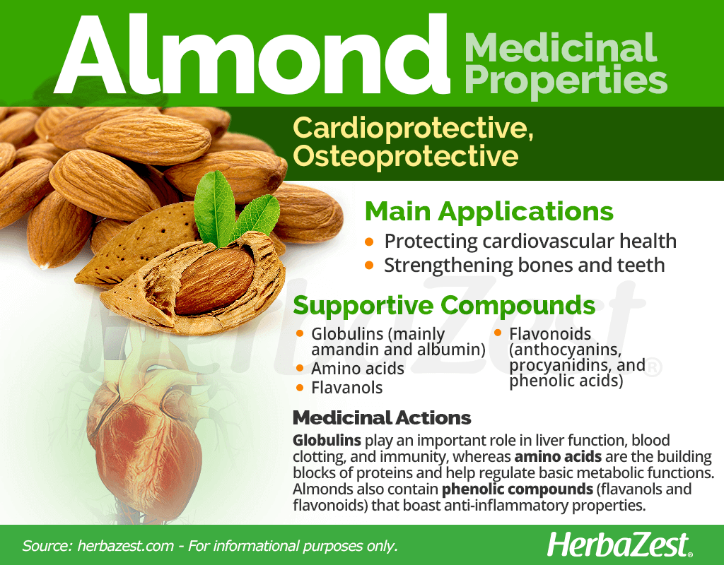 Protecting cardiovascular health. It has been shown that almonds help regulate cholesterol levels, as well as blood pressure, thus reducing the risk of heart disease.1