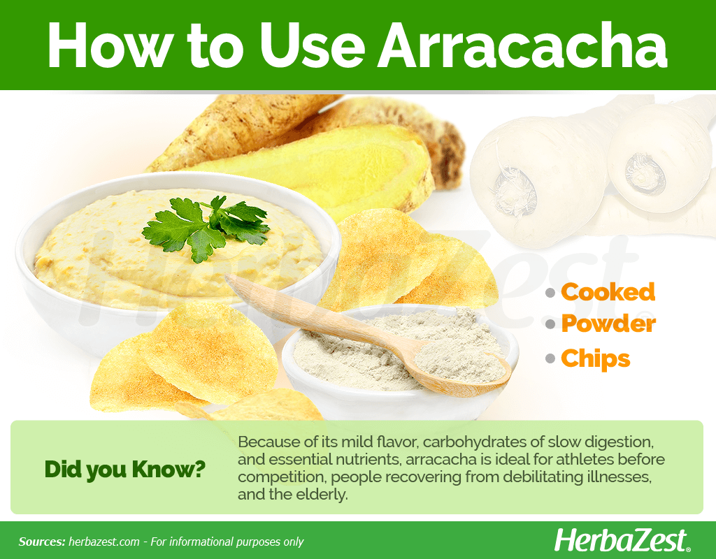 Promoting digestive health. Arracacha is rich in resistant starch, which promotes smooth digestion and a healthy intestinal flora, including relieving both constipation and diarrhea.