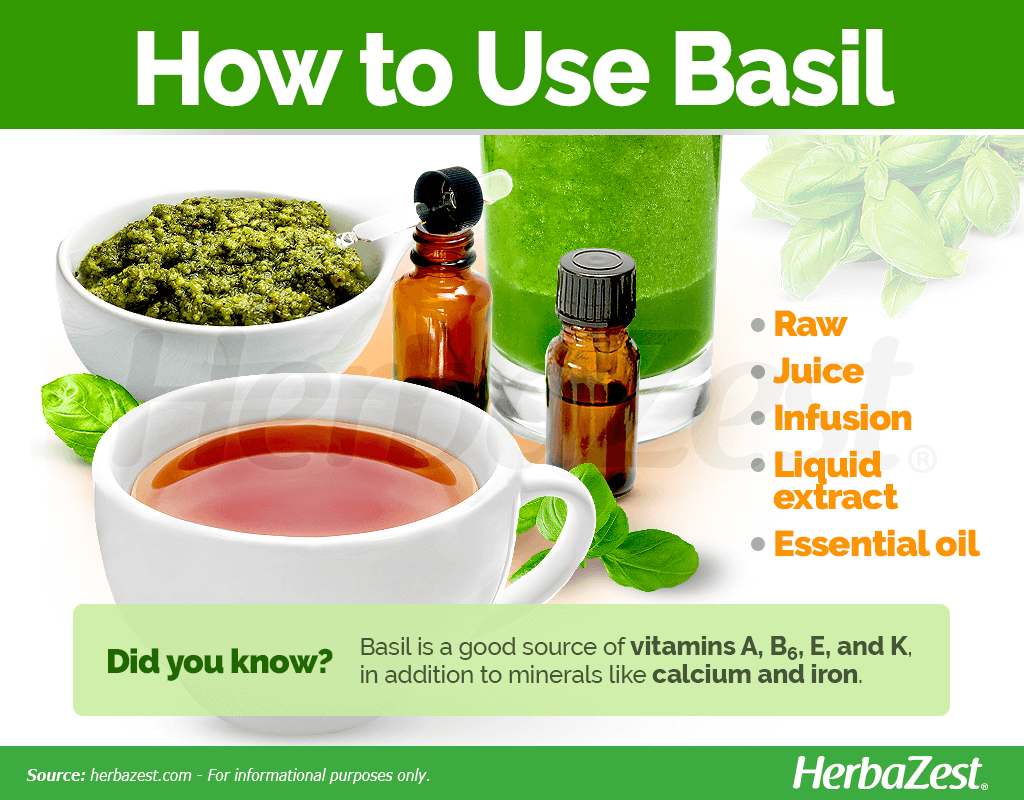 Infusion. A hot basil tea offers numerous medicinal effects. It can alleviate flatulence, heal gastric infections, and prevent blood clots.