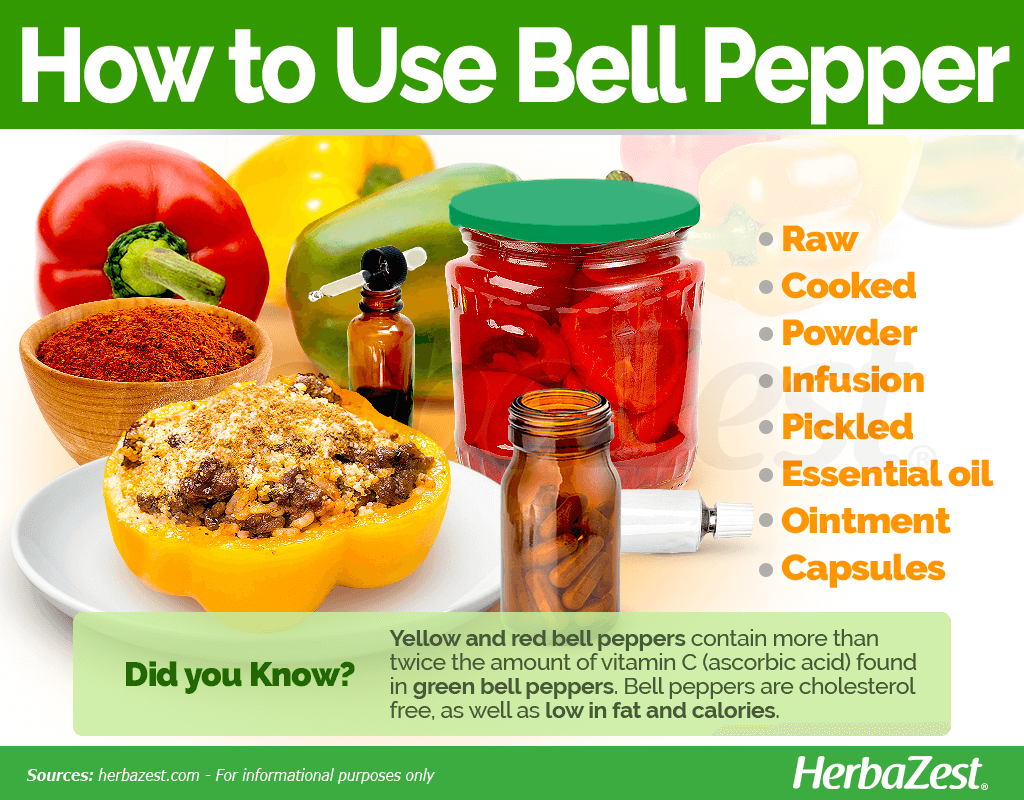 Bell peppers are commonly used for culinary purposes. They can be bought in various colors and sizes, fresh or in powder, which can make meals more interesting by bringing a sweet taste and a crunchy texture. However, bell peppers' health benefits can also be obtained form medicinal preparations.