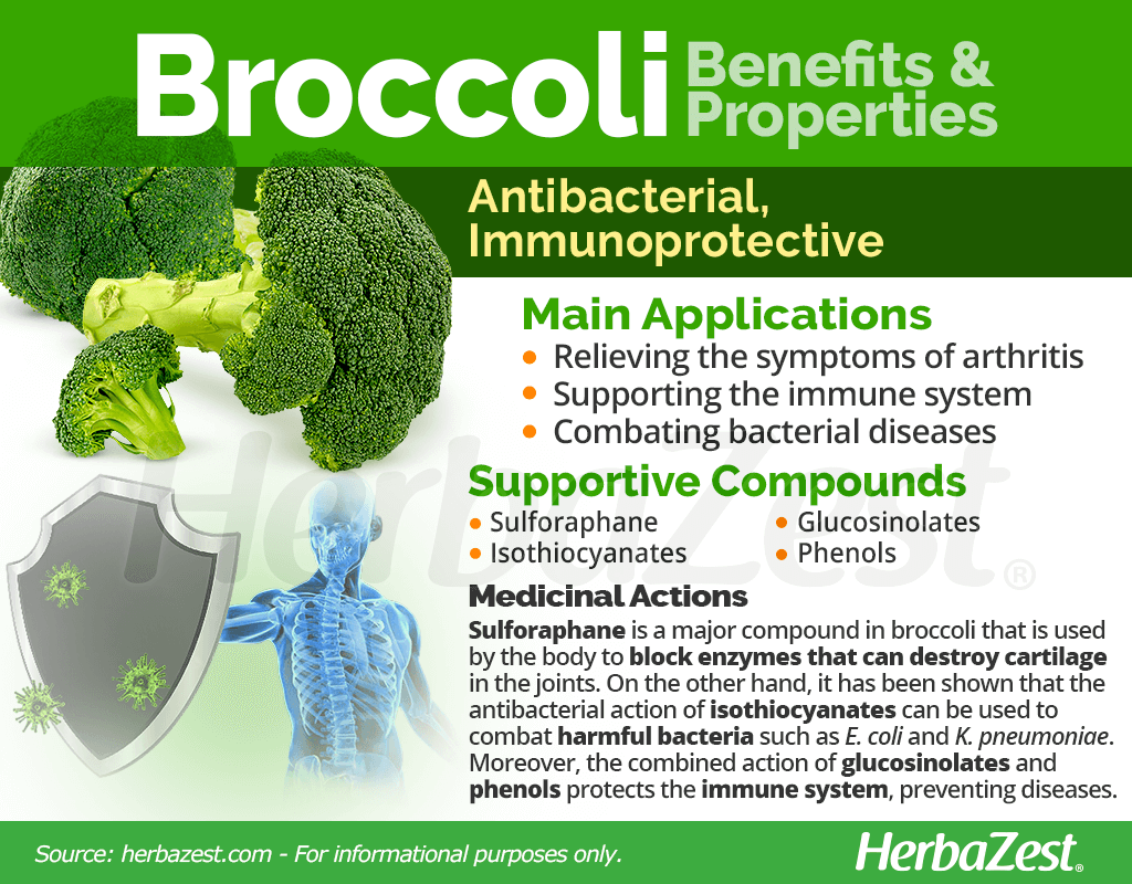 A major constituent present in broccoli is sulforaphane. Studies have revealed that this compound, responsible for the most remarkable broccoli's benefits, may be useful in preventing and treating arthritis. When broccoli is eaten, sulforaphane is released and used by the body to block enzymes that can destroy cartilage in the joints.1