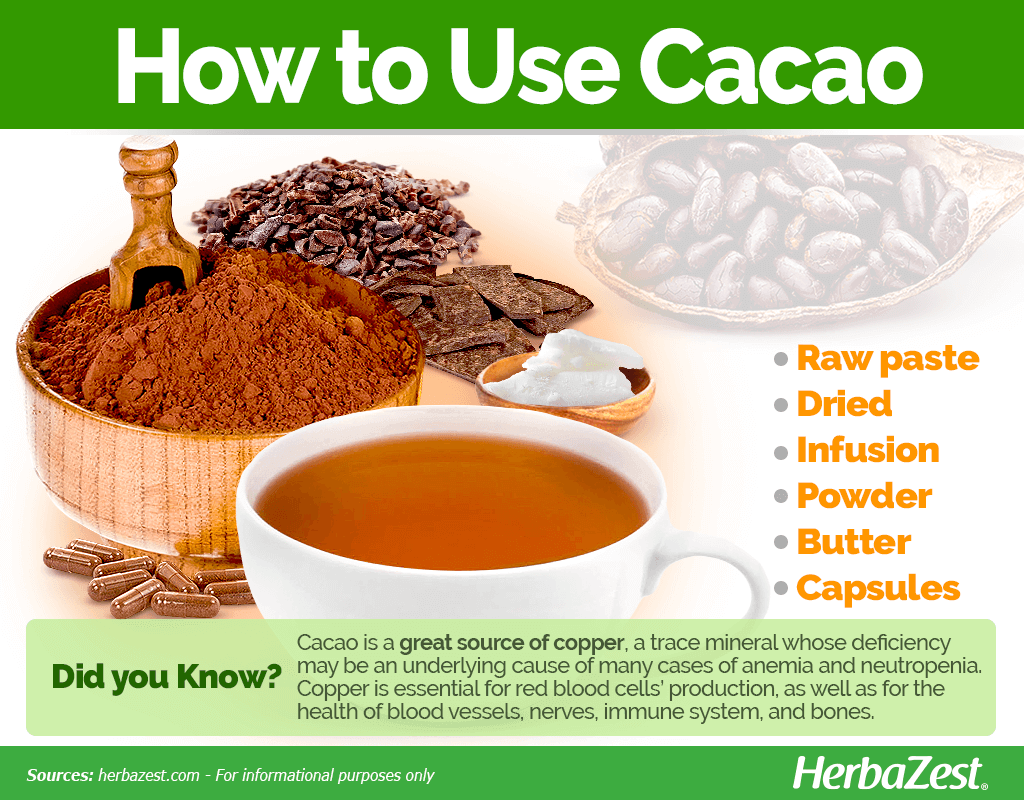 • Infusion. A warm tisane can be brewed using cacao nibs or husks for a mild energy boost, due to its theobromine content.