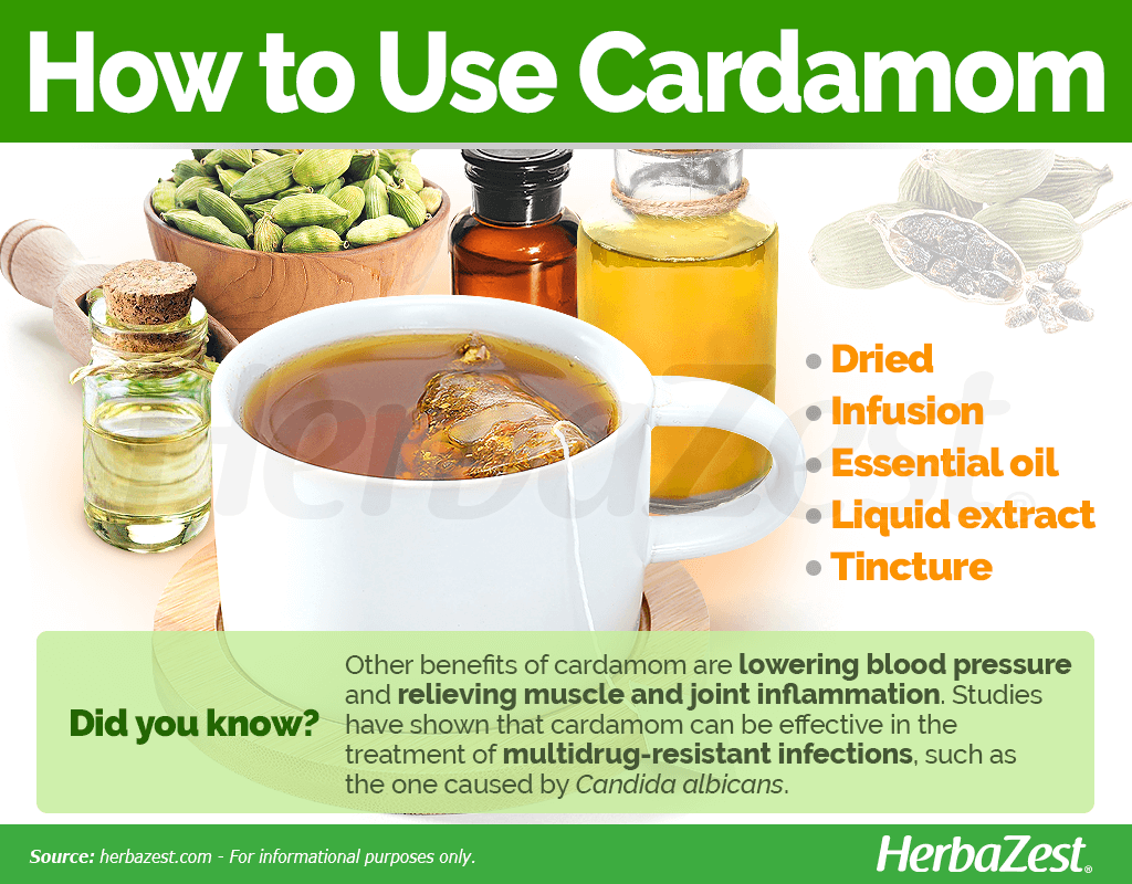 Infusion. When brewed into a hot tea, cardamom eases stomach complains and lower blood pressure.