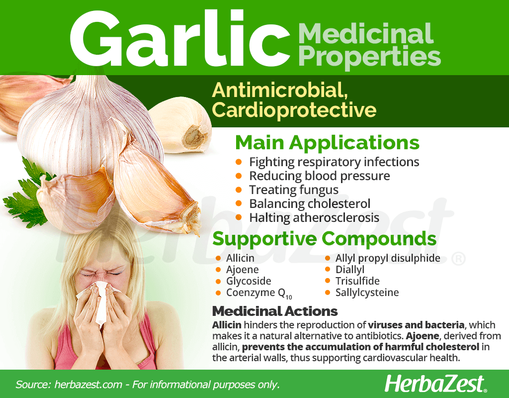 Garlic owes most of its medicinal properties to the sulfuric compounds allicin and ajoene.1,2 Allicin, an organosulfur compound, is the most potent one, providing garlic with its distinct aroma and its antibacterial and antifungal action. Ajoene, derived from allicin, also has blood-thinning and lipid-lowering action.