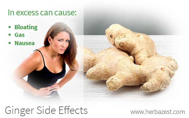 Although most research suggests that consuming ginger is safe, and side effects are typically not reported if taken in small doses, like all good things, having too much ginger can have undesirable consequences. Some reported side effects of ginger associated with overconsumption include gas, bloating, mild heartburn, nausea, belching, diarrhea, and mouth irritation.