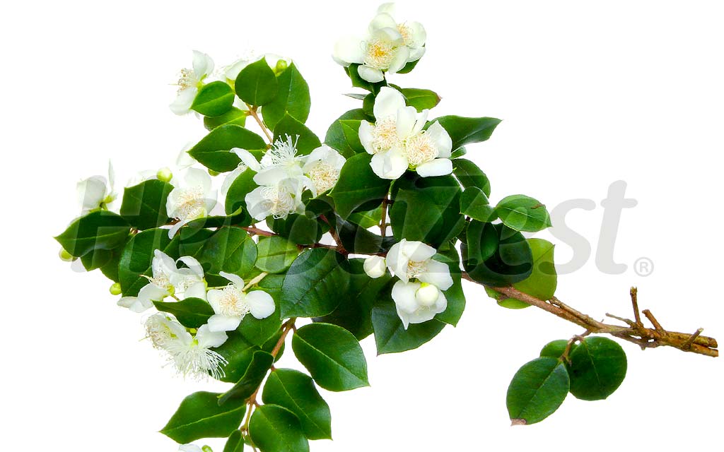Technically a shrub, this plant is sometimes classified as a small tree, because it can reach heights of up to 16 ft (5 m). Its star-like flowers are usually white with numerous stamens, and its fruit is a round, blue-black berry. The essential oils present in the leaves give off its signature aroma.