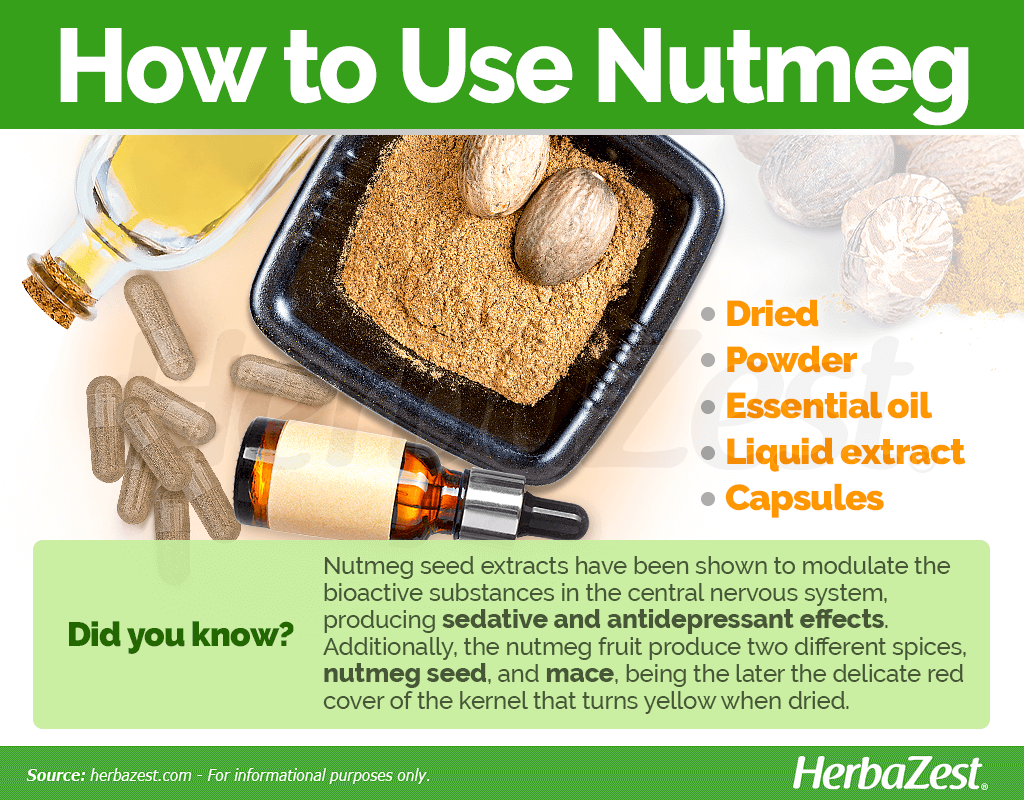 Liquid extract. In this supplemental form, nutmeg can be diluted in a glass of water, juice, or other drink of preference and ingested to alleviate gastrointestinal problems and even insomnia thanks to its mild sedative properties. However, it is recommended to consult to a physician before consuming any herbal tinctures for therapeutic purposes.