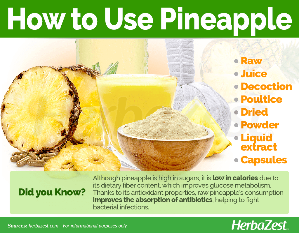 Pineapple health benefits are most popularly obtained from fresh consumption and culinary preparations; however, bromelain, an enzyme mixture responsible for the fruit's most medicinal properties, can be extracted from the fruit's stem or juice. It can also be consumed in supplemental forms for more potent effects.