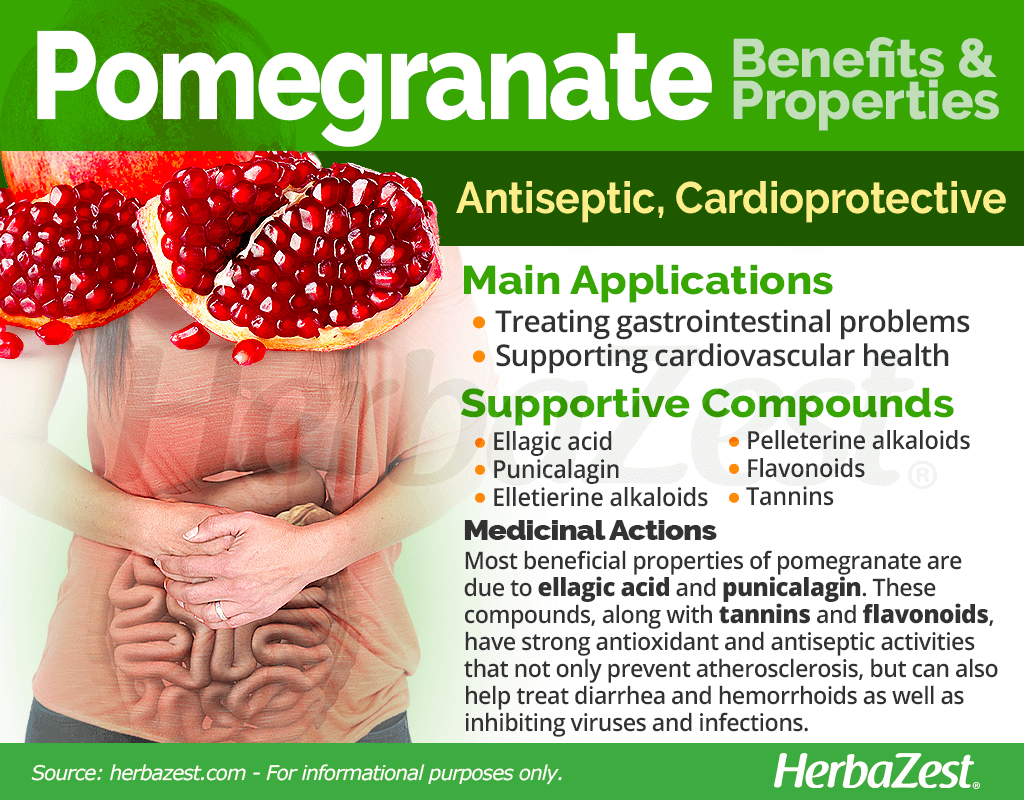 Treating gastrointestinal problems. Due to its antiseptic, anti-inflammatory, and astringent properties, pomegranate haven been traditionally used for alleviating diarrhea, dysentery, cholera, upset stomach, and hemorrhoids, as well as for eliminating intestinal parasites.