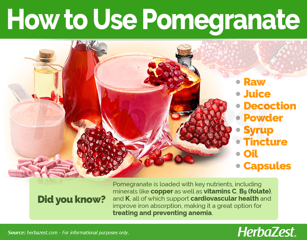 Tincture. The crushed seeds of pomegrate, as well as its fresh juice can be added to an alcohol solution and be kept aside for few weeks until the properties of the herb have been extracted. Few drops of this tincture are diluted in water for medicinal effects.