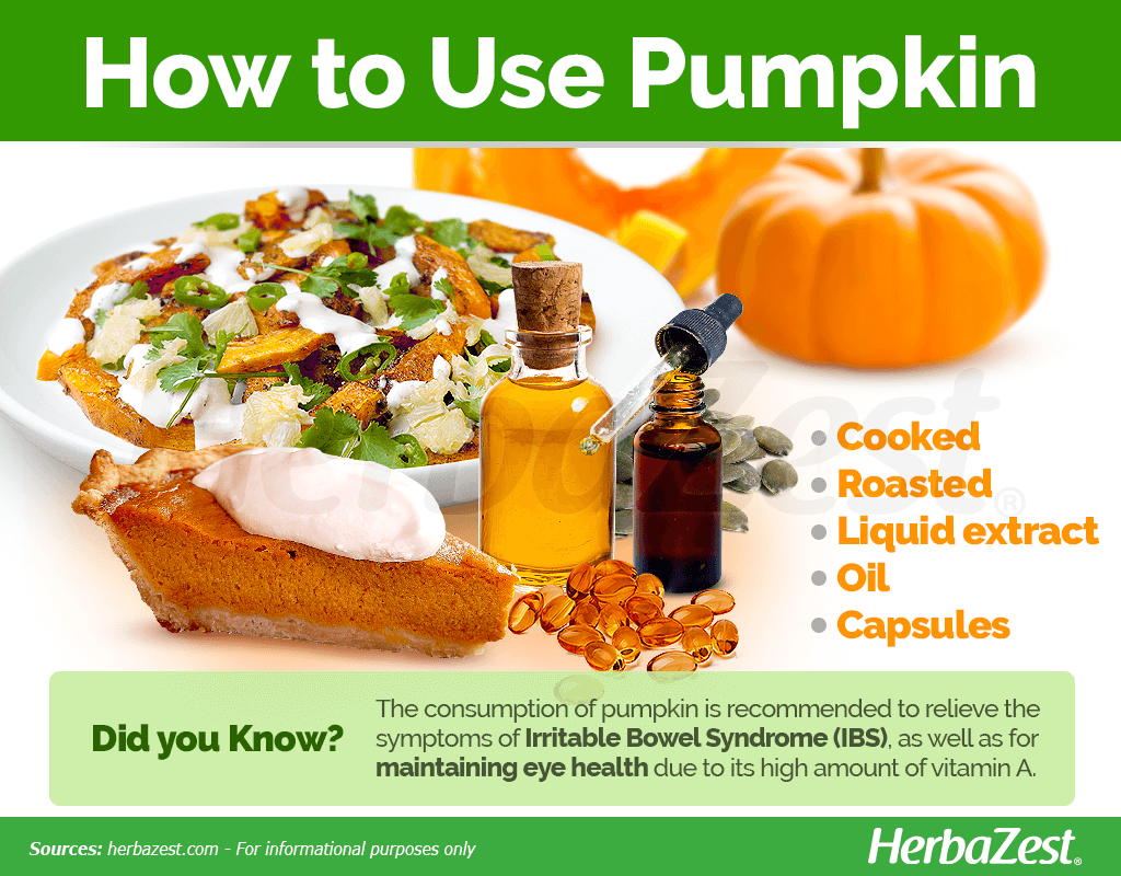 There are many ways to incorporate pumpkin into a healthy diet. Most usually consumed as food, pumpkin can also be found as a supplement, which concentrates its medicinal benefits.