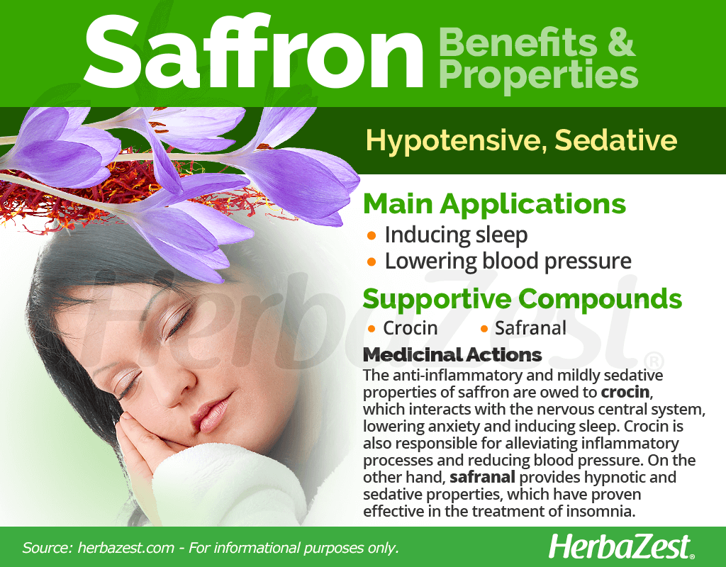 Infusions. When steeped in hot water, saffron's sedative properties can help treat sleep disorders. This preparation also lowers blood pressure.