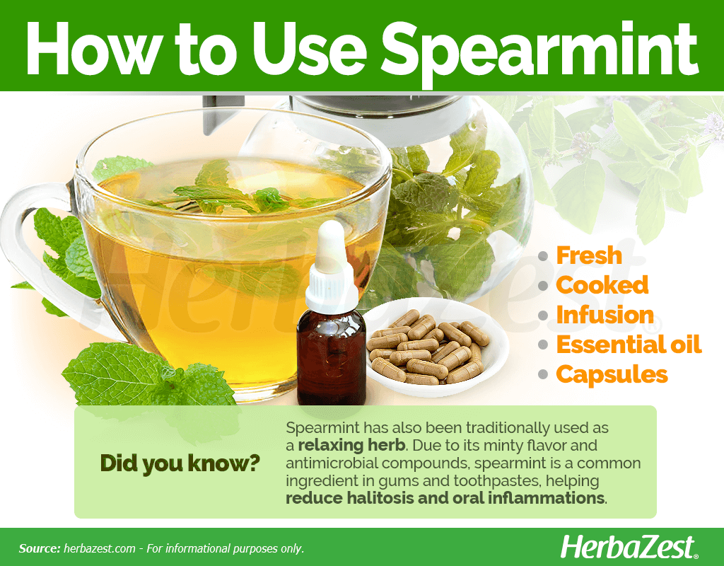 Spearmint leaves have a wide variety of uses. They can be picked and consumed right off the stem, steeped in a warm and delicious herbal tea, used to flavor water, or even cocktails. They can also be added to salads, fish, fruit, or meat dishes, or made into vinegar, jelly, or sauce. However, in order to make the most of spearmint benefits, it is best to consume the herb in medicinal forms.