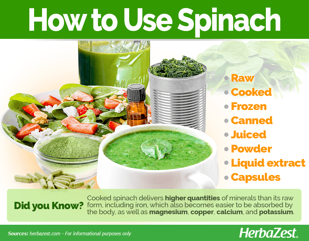 Spinach has very few forms of consumption outside of culinary preparations. Eating spinach is the easiest way to absorb its nutrients and benefit from its medicinal properties, so it is commonly used as an ingredient in the kitchen.