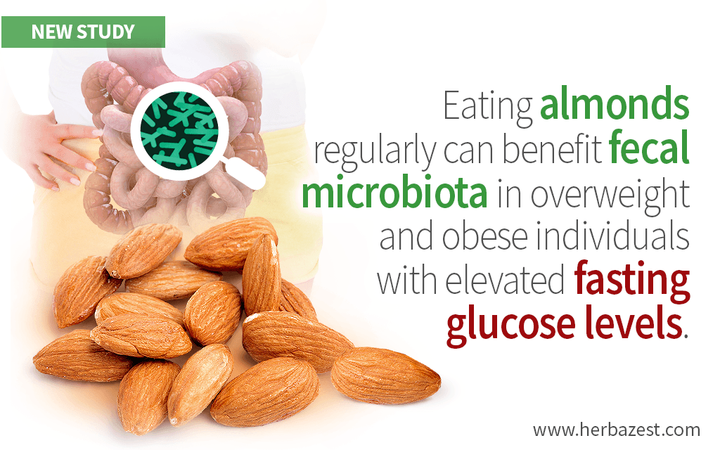 This study provides evidence on the effects of eating almonds on human gut microbiota, particularly on the abundance and diversity of fecal bacterial species as well as stool pH and moisture in adults with excess weight and high glucose levels.