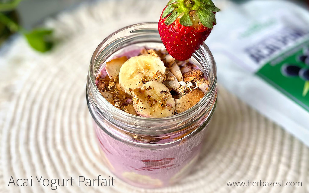 This acai yogurt parfait is great if you are looking for a quick and flavorful breakfast on a weekday. Apart from nourishing your body with protein from Greek yogurt, it will fill you up with antioxidants from acai. It's not only quick and easy, but it can also be made ahead of time to speed up your morning routine.