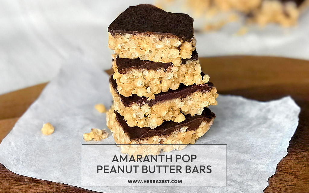 These no-bake chocolate peanut butter bars are made with amaranth pop, instead of puffed rice. Covered with dark cacao, they're not only sweet, crunchy, and delicious, but they also almost take no time to make. Thanks to amaranth and peanuts, they are rich in protein and fiber. We guarantee they'll disappear faster than you think, and you'll be making another batch soon!