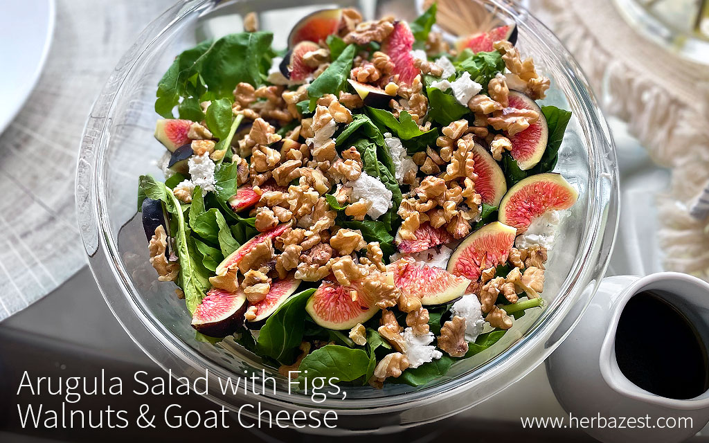 - Top the arugula with toasted walnuts, crumbled goat cheese, and figs. Enjoy right away!(2 minutes)