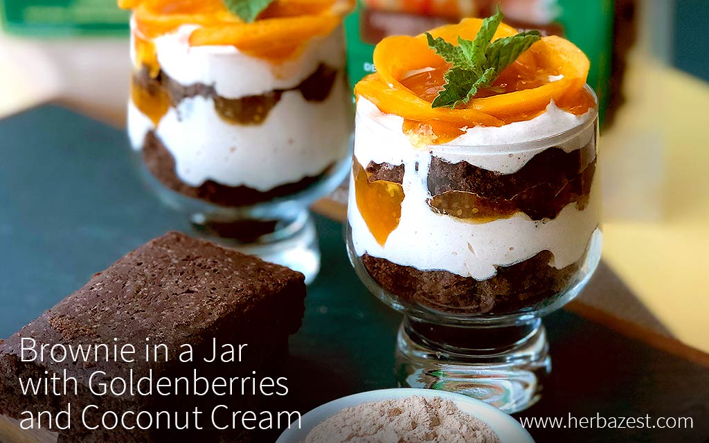 This brownie in a jar is bathed in a unique combination of whipped coconut cream and an exotic goldenberry jam. The good news is that it is actually made from wholesome ingredients, making it a much healthier dessert. Goldenberries are rich in vitamins A and C, among other nutrients, contributing to their anti-inflammatory properties. Coconut milk whipped with agave syrup and vanilla is a lighter substitution for the classic whipped cream. It is also a good source of vitamins and minerals helpful for maintaining healthy bones and strong hearts.
