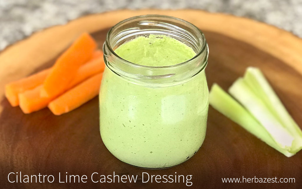 This cilantro lime cashew dressing comes together in a matter of minutes and can brighten up otherwise ordinary meals. Having a neutral flavor, cashews are a great base for homemade dressings and creams. This particular recipe has lovely cilantro and lime undertones that will go well with veggie burgers and salads. It is also thick enough to be eaten as a dip with fresh veggies.