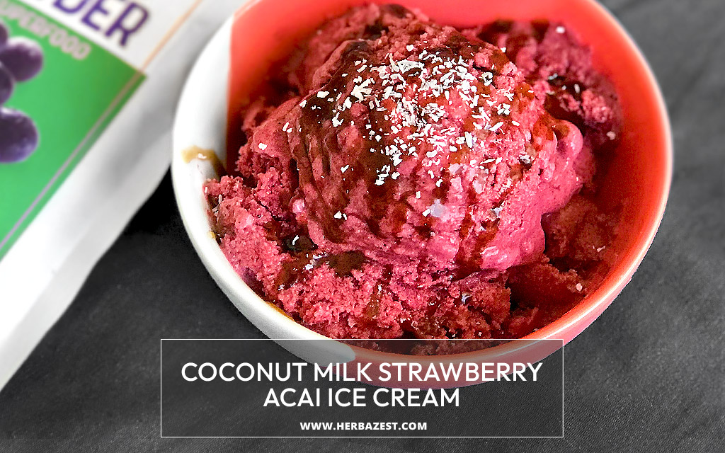 This strawberry acai ice cream with coconut milk is a particularly wholesome dessert. Both strawberries and acai are packed with antioxidants and dietary fiber, while the milk from coconut is naturally rich in healthy fats. If you like your ice cream on a tart side or if your strawberries are very sweet, you can even skip the maple syrup.