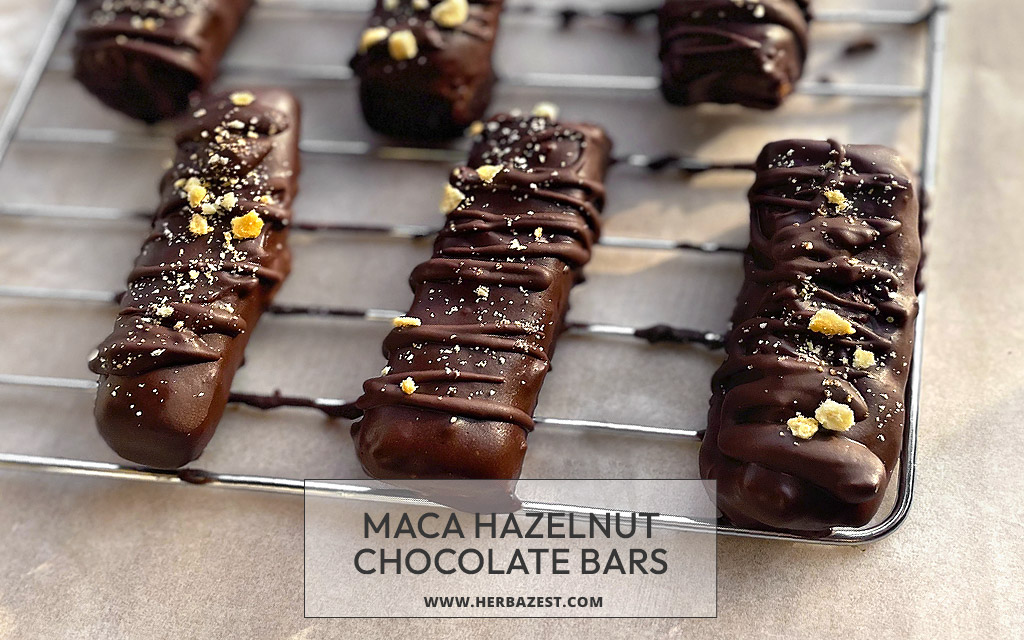 These decadent maca hazelnut chocolate bars have a soft, nutty inside and are coated in a layer of melted dark chocolate. Maca is known for its benefits on hormonal health, while hazelnuts are rich in healthy fats, antioxidants, and minerals that will enhance your nutrition. Cacao, the main ingredient in dark chocolate, is a source of polyphenols, which have been widely associated with health benefits.