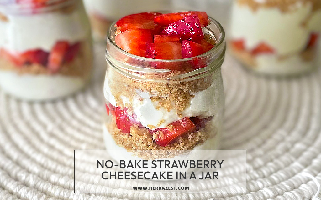 This no-bake strawberry cheesecake in a jar is a delicious and easy dessert that you can make in minutes. Each jar is layered with a creamy and tangy cheesecake filling, a crunchy and buttery crust, and a sweet and juicy strawberry topping. This mouthwatering dessert is perfect for any occasion, whether it's a picnic, a party, or a cozy night at home.