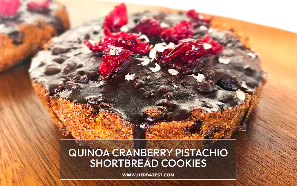 These quinoa shortbread cookies with cranberries and pistachios are nutty, crumbly, and truly delightful. But more importantly, they are made with healthy ingredients. Ground almonds and quinoa add a crunchy texture and protein, whereas pistachios and cranberries enrich the dough with fiber, healthy fats, and mild sweetness. Topped with dark chocolate, these quinoa shortbread cookies are here to stay!