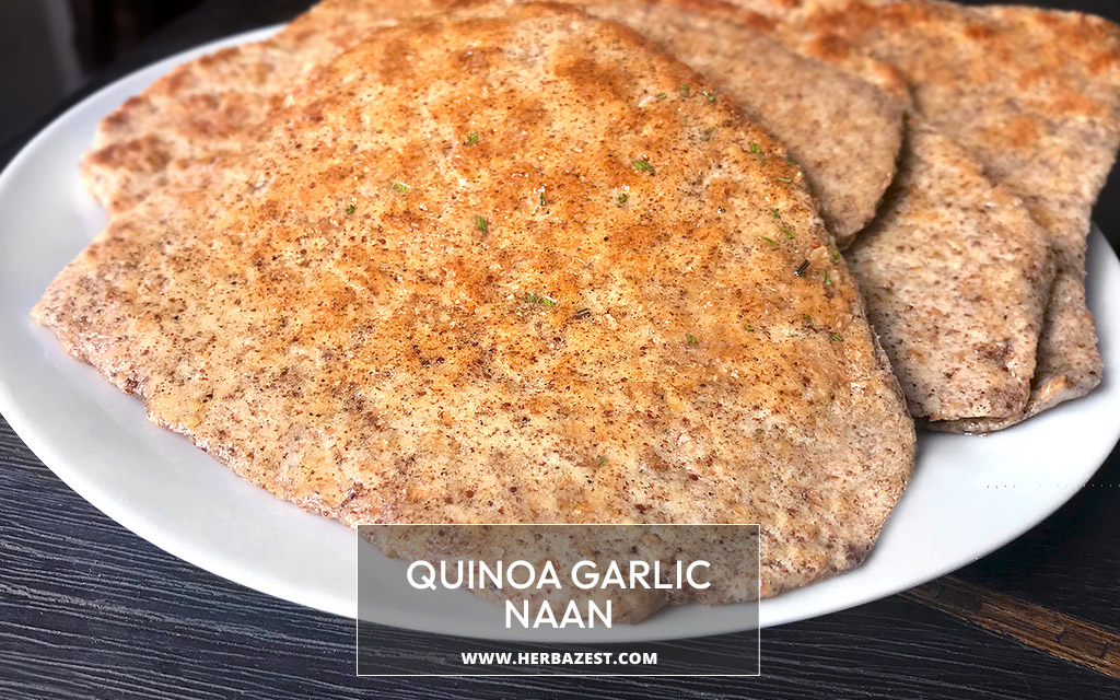 This garlic naan with quinoa is a healthy twist on a Persian classic. It can be enjoyed in a number of ways, from eating it like a wrap to using it as pizza crust to soaking it in some delicious, homemade stew. It is also soft yet sturdy enough to be turned into a healthy sandwich! Because it is enriched with quinoa flour, its nutritional content -particularly in protein - is much higher than in the traditional recipe. The addition of garlic butter gives this quinoa naan a delicious flavor and aroma.