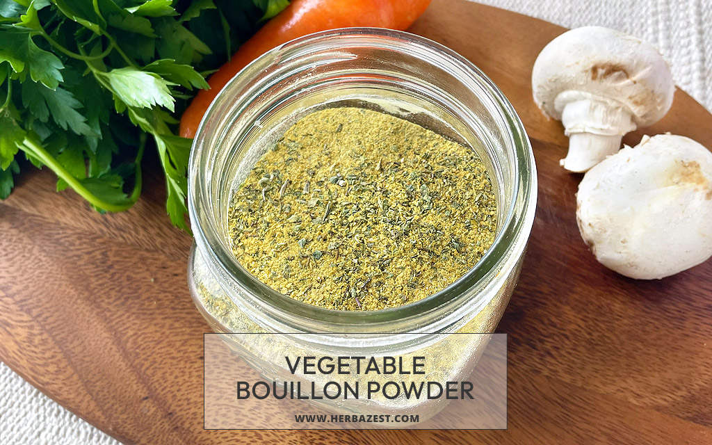 It's easy to use this homemade vegetable bouillon powder in so many recipes! Add it to stews, stir fries, and pasta sauces. Or use it as a substitute for veggie broth in risottos, soups, and more (mix 1 TBS of vegetable bouillon powder with 1 cup of hot water)!