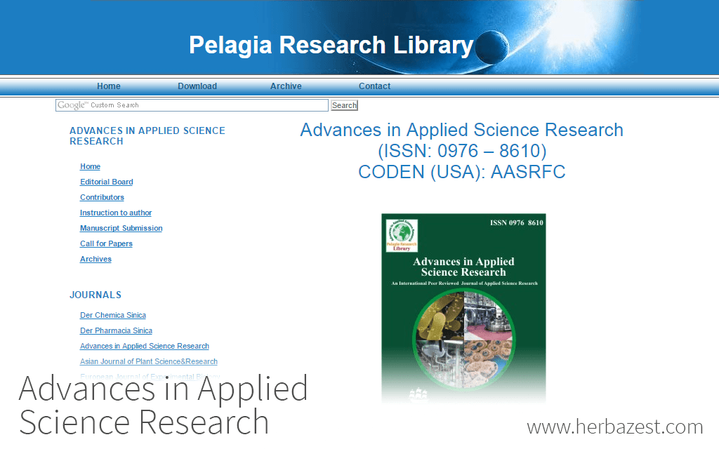 Advances in Applied Science Research is an international, peer-reviewed journal that is published electronically. It is multidisciplinary, covering research topics ranging from agricultural sciences, biodiversity, and environmental sciences to astronomy, chemistry, and geology. It comes out with issues once every two months and is indexed in databases like EBSCO. The current executive editor is Mohamed Ali Hassouba.