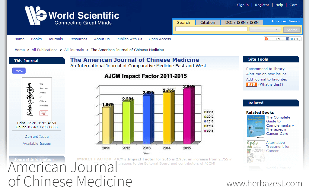 The American Journal of Chinese Medicine was first published in 1973 and has bimonthly issues. While Traditional Chinese Medicine is obviously a focus, the scope of the journal is much wider - it also features alternative medicine practices from all cultures. In addition to indigenous therapies and medicinal plants, it is also concerned with public health around the world from different historical, cultural, and socioeconomic viewpoints. Its current editor-in-chief is Chun-Su Yuan, and its 2013 impact factor is 2.625, continuing a steady increase from previous years.