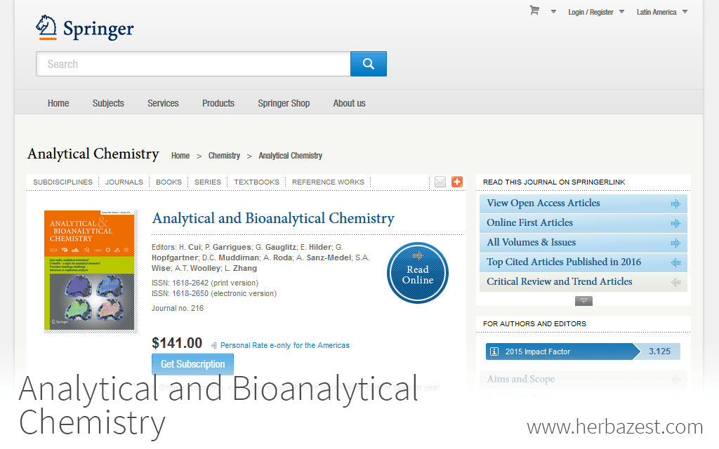 Analytical and Bioanalytical Chemistry is a highly-ranked, peer-reviewed scientific journal first founded in 1862, under the name Fresenius' Journal of Analytical Chemistry. They publish research on different wings of the analytical chemistry field, such as metallomics, ionics, or mass spectrometry. The journal publishes three issues per month and has a 2013 impact factor of 3.578.