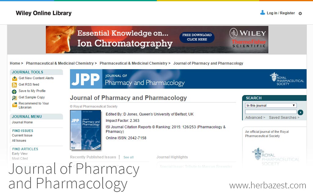 The Journal of Pharmacy and Pharmacology is the scientific, peer-reviewed journal of the Royal Pharmaceutical Society, based in the U.K. It was first established in 1870, but did not acquire its current name until 1949. It features research relating to all parts of pharmacology, including drug delivery engineering and how cells respond to compounds. Its impact factor, according to 2013 calculations, is 2.161. It is indexed in approximately 20 databases, including PubMed and the Science Citation Index.