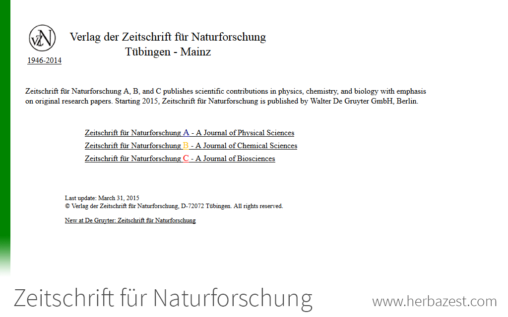 Zeitschrift für Naturforschung, German for "Journal for Nature Research," was founded in 1946 by a group of scientists from the Kaiser Wilhelm Institute. It has been split into three volumes – A, B, and C – one for each of the three branches it covers: physics, chemistry, and biosciences. It has new issues monthly. Volumes that were published prior to 2011 have been made free to access. Although it was once published in German, it is now published in English.