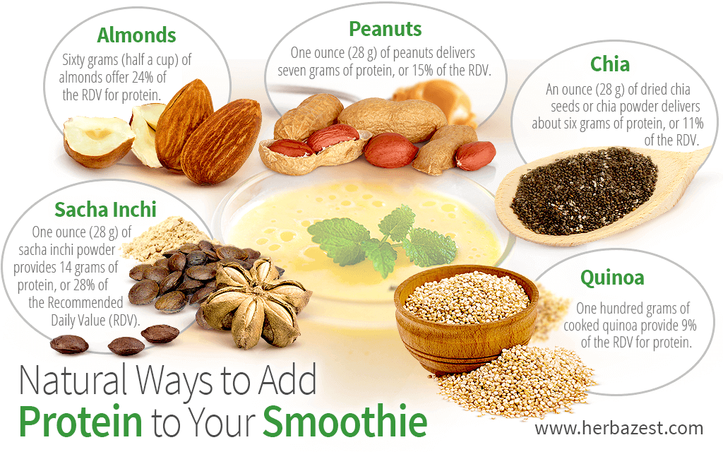 Almonds are one of the best sources of protein. Only 60 grams (half a cup) of almonds offer 24% DV for protein. Almonds are also among the least caloric nuts and have high levels of antioxidants, especially vitamin E. Almonds can be added to smoothies whole, raw, roasted, or as vegetable milk, although the last form won't provide as much fiber.